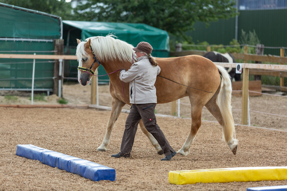 Anspruchsvolle Bodenarbeit, um erste Lektionen an der Hand erarbeiten: In der ECW arbeiten wir am Kappzaum mit Zügeln. Im Wechsel werden versammelnde und lösende Übungen durchgeführt. Losgelassenheit und Muskulatur werden gleichzeitig gefördert. Ebenso das Zuhören.